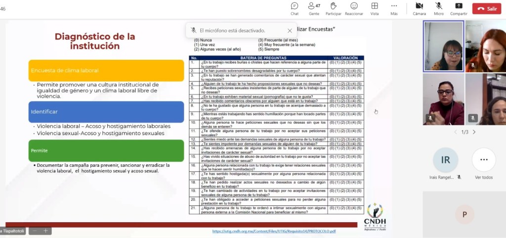 Con más apoyo en la profesionalización de las y los trabajadores para un mejor desempeño de sus funciones, el Instituto de las Mujeres del Estado (Imes), a través del Área de Capacitación, promovió ante la Comisión Nacional de los Derechos Humanos (CNDH), 10 sesiones virtuales y una presencial que se ofrecen los días martes a partir del 30 de enero.