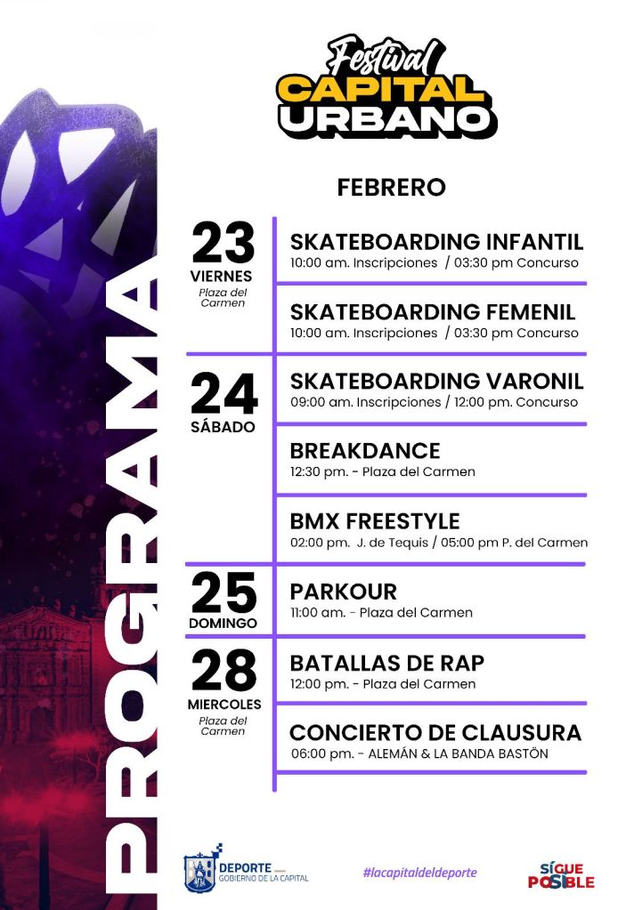 Además se contempla el concurso de break dance a las 12:30 del día también en la Plaza del Carmen, mientras que la competencia de BMX Freestyle se efectuarán desde las 14:00 horas en el Jardín de Tequis y a las 17:00 horas se trasladarán a la Plaza del Carmen.