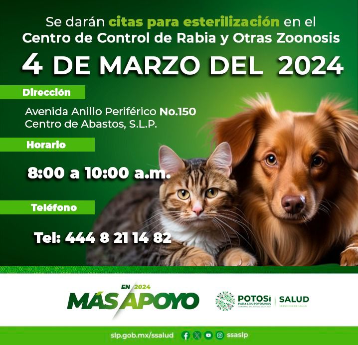Este próximo lunes 04 de marzo se darán citas para esterilizaciones, en horario de 08:00 a 10:00 de la mañana de manera presencial o en los teléfonos 444 821 1482 y 444 821 2792 extensión 2. Algunos requisitos que debe saber la ciudadanía para poder solicitar esterilizaciones son: las mascotas deberán ser mayor de 6 meses de edad, hembras no embarazadas y no lactando, y se opera solo a pacientes sanos acompañados de una persona mayor de edad.