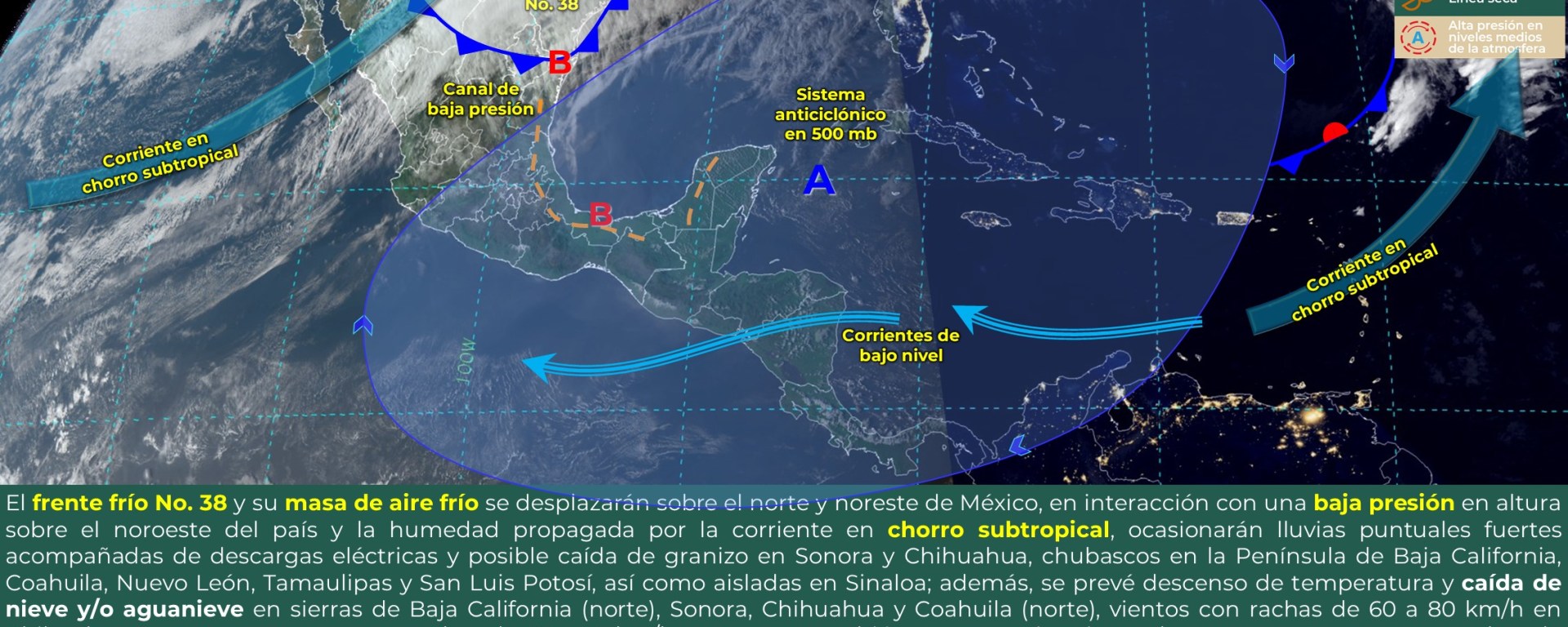 Vientos con rachas de 40 a 60 km/h y posibles tolvaneras: Baja California, Baja California Sur, Sonora, San Luis Potosí, Zacatecas, Aguascalientes, Jalisco, Colima, Michoacán, Guanajuato, Querétaro, Hidalgo, Puebla, Tlaxcala, Estado de México, Ciudad de México, Campeche y Yucatán.
