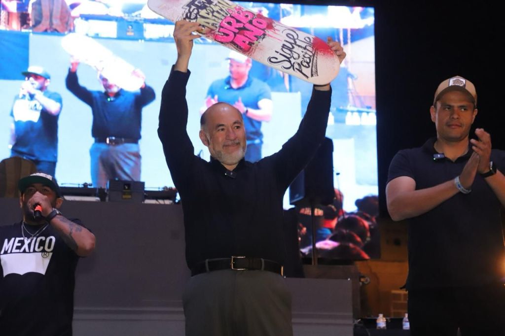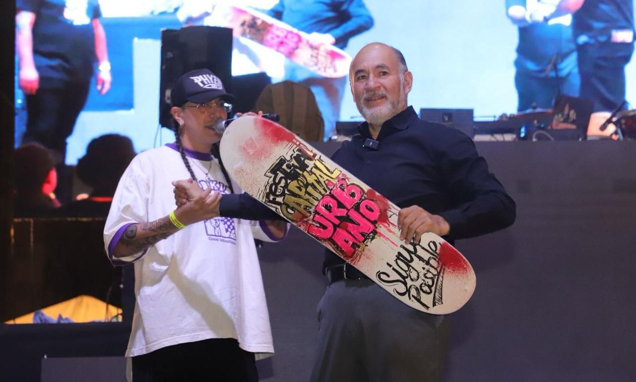 El Alcalde Enrique Galindo entregó un reconocimiento a La Banda Bastón por su participación en este evento, con el que el Ayuntamiento de la Capital celebra la creatividad y destrezas de jóvenes talentosos en disciplinas como skate, BMX, parkour, graffiti, rap y break dance. En respuesta, los integrantes de La Banda Bastön regalaron al Alcalde Galindo una patineta, como símbolo de las acciones del Ayuntamiento para dar alternativas de esparcimiento equitativas para la ciudadanía de la Capital