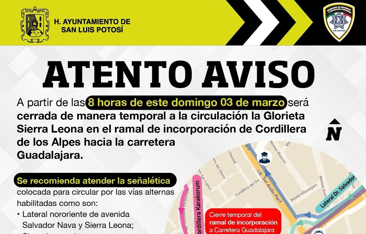 El Ayuntamiento de San Luis Potosí, a través de la Dirección de Obras Públicas informa a la ciudadanía que a partir de las 8 horas de este domingo 3 de marzo será cerrada a la circulación la Glorieta Sierra Leona en el ramal de incorporación de Cordillera de los Alpes hacia la carretera Guadalajara.