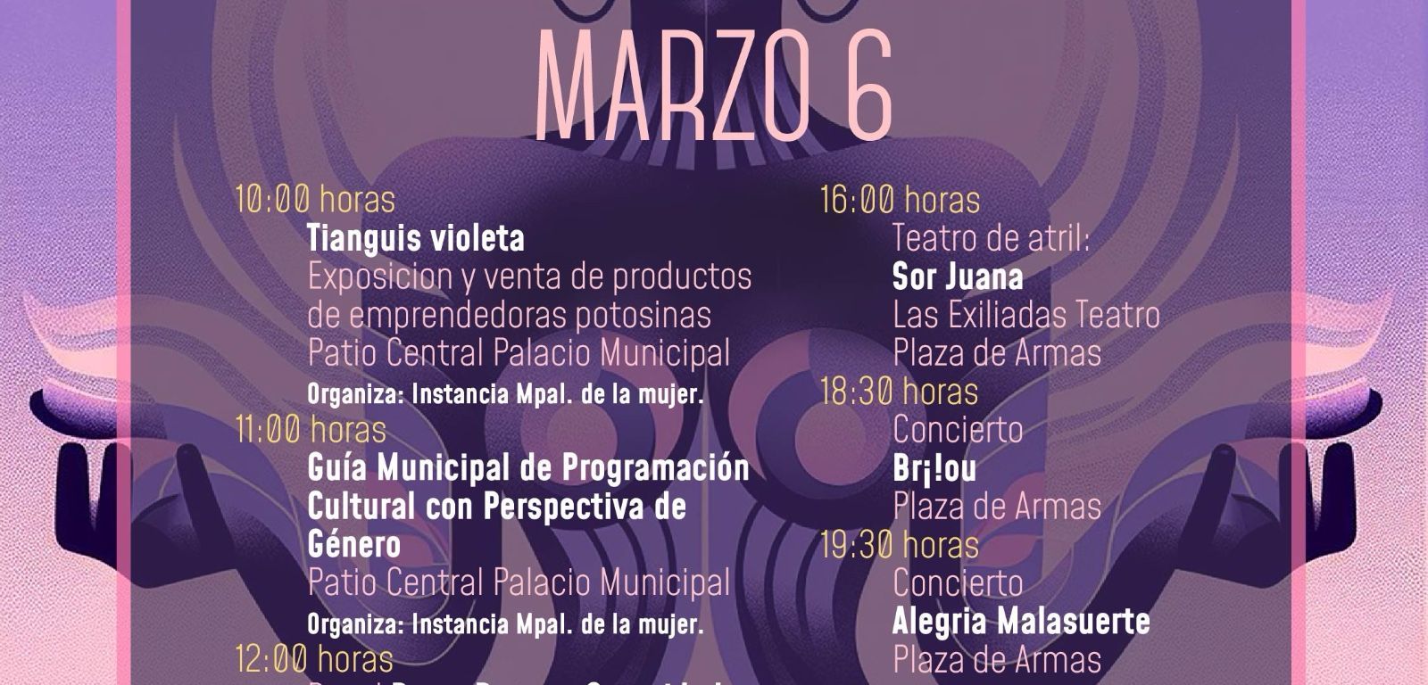 Tianguis Violeta, con exposición y venta de emprendedoras potosinas. Organiza la Instancia de las Mujeres. Miércoles 6 de marzo. 10:00 horas. Centro Cultural Palacio Municipal.