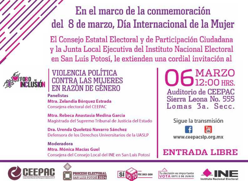 Como parte de las actividades para conmemorar el Día Internacional de la Mujer, el Consejo Estatal Electoral y de Participación Ciudadana (CEEPAC) y la Junta Local Ejecutiva del Instituto Nacional Electoral (INE) convocan al Foro de Inclusión “Violencia Política contra las Mujeres en Razón de Género” a realizarse el próximo miércoles 6 de marzo en las instalaciones del CEEPAC.