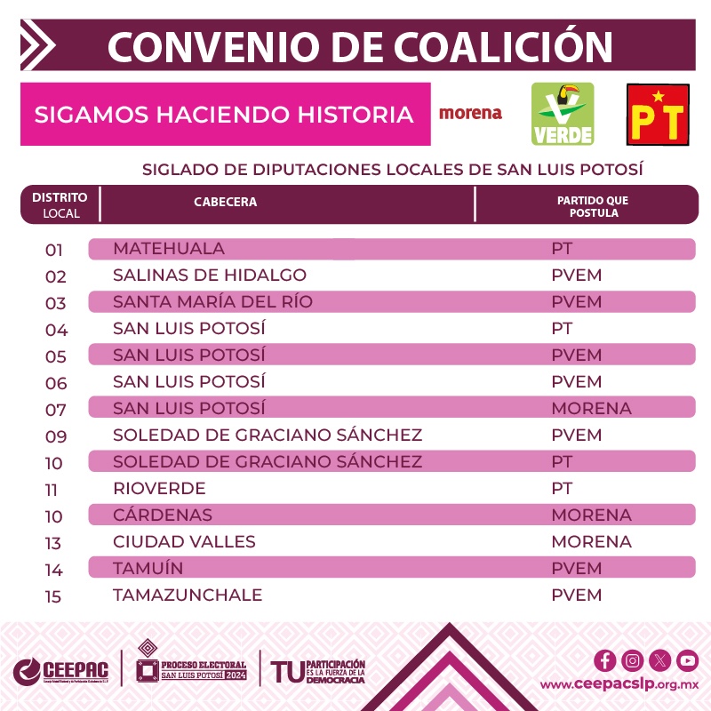 La Coalición Sigamos Haciendo Historia en San Luis Potosí, modificó el siglado de los cargos a diputaciones, para definir a que partido postulará en cada uno de los distritos, quedando de la siguiente forma: