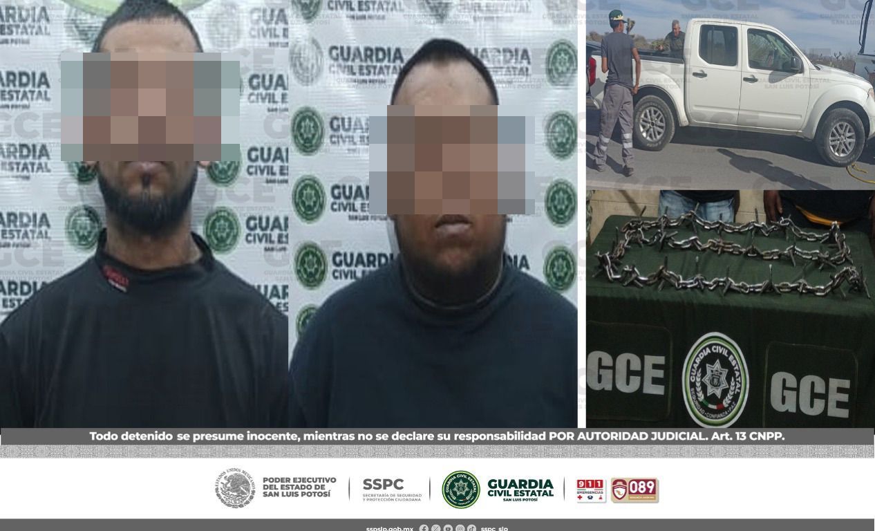 Los presuntos fueron detenidos luego de asegurarles la unidad que contaba con reporte de robo del 14 de febrero del año en curso, del municipio de Moctezuma. En el interior de la unidad se aseguró una cadena metálica de tres metros aproximadamente, adaptada con objetos de varilla conocidos como “poncha llantas”.