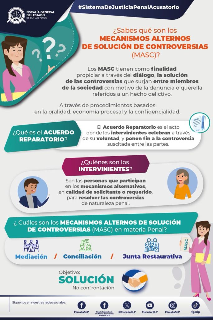 La Fiscalía General del Estado de San Luis Potosí (FGESLP) lleva a cabo la implementación de los Mecanismos Alternativos de Solución de Controversias (MASC), iniciando en cuatro municipios aledaños a la Capital del Estado.
