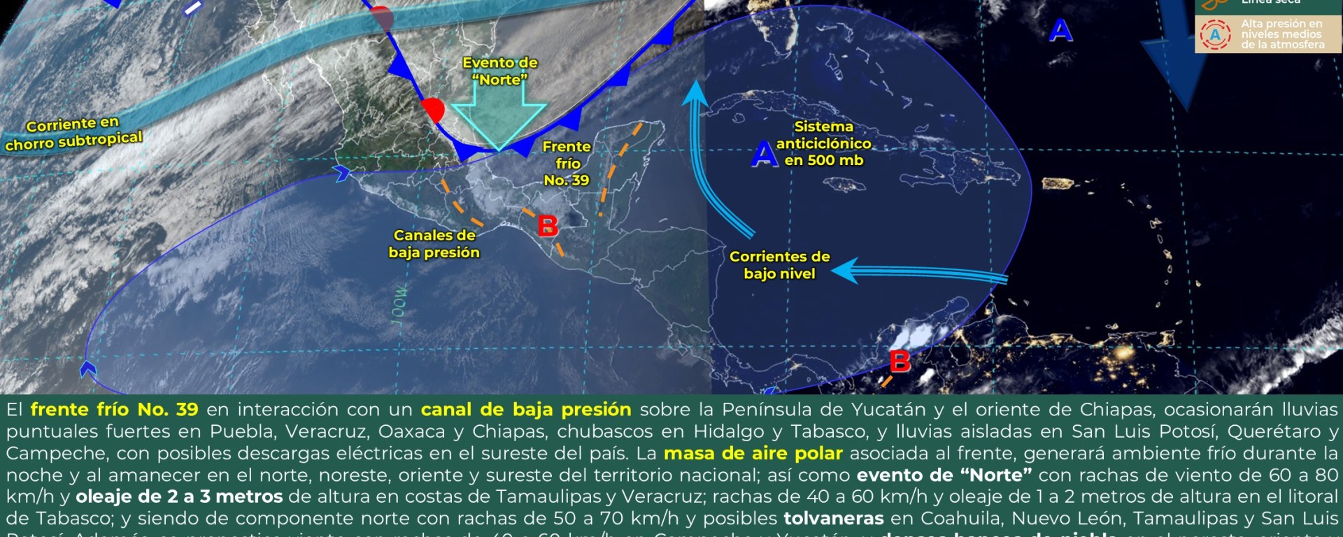 Evento de “Norte” con rachas de viento de 70 a 90 km/h: Istmo de Tehuantepec; y con oleaje de 2 a 3 metros de altura: costa de Veracruz y Golfo de Tehuantepec; con rachas de viento de 40 a 60 km/h y oleaje de 1 a 2 metros de altura: costas de Tamaulipas, Campeche y Yucatán, y con oleaje de 2 a 3 metros de altura en: costas de Tabasco.