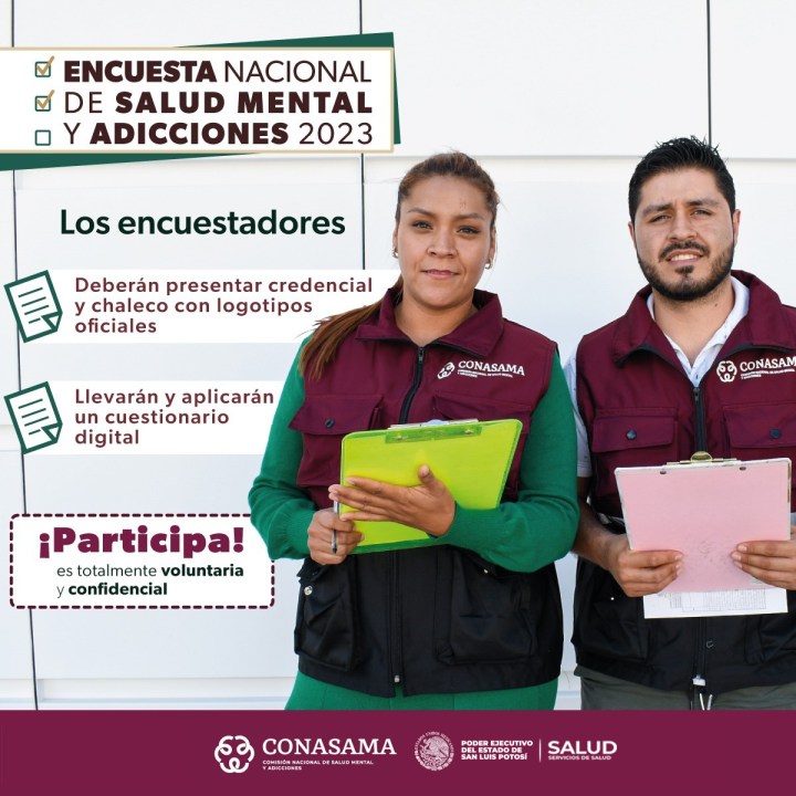 La Encuesta Nacional de Salud Mental y Adicciones 2023 (ENASAMA) dirigida por la Comisión Nacional de Salud Mental y Adicciones (CONASAMA) tiene como objetivo general estimar la dimensión del consumo de sustancias psicoactivas como el alcohol, tabaco y otras drogas y evaluar condiciones de salud mental, entre ellas el comportamiento suicida, a nivel nacional y estatal, en población de 12 a 75 años.