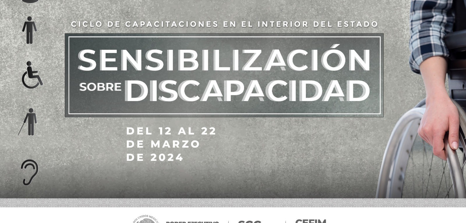 Del 12 al 22 de marzo, el Poder Ejecutivo del Estado, a través de la Coordinación Estatal para el Fortalecimiento Institucional de los Municipios (CEFIM), acercará a las y los trabajadores de los ayuntamientos Rioverde, Matehuala, San Luis Potosí, Ciudad Valles y Tamazunchale, el ciclo de capacitaciones “Sensibilización sobre la Discapacidad”, para garantizar la inclusión y acceso a servicios para personas con discapacidad.