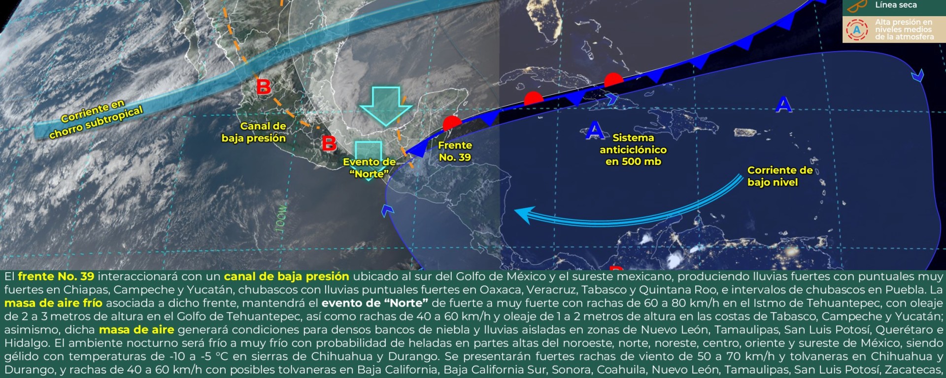 Viento de componente norte con rachas de viento de 40 a 60 km/h: Istmo de Tehuantepec; y con oleaje de 1 a 2 metros de altura: Golfo de Tehuantepec.