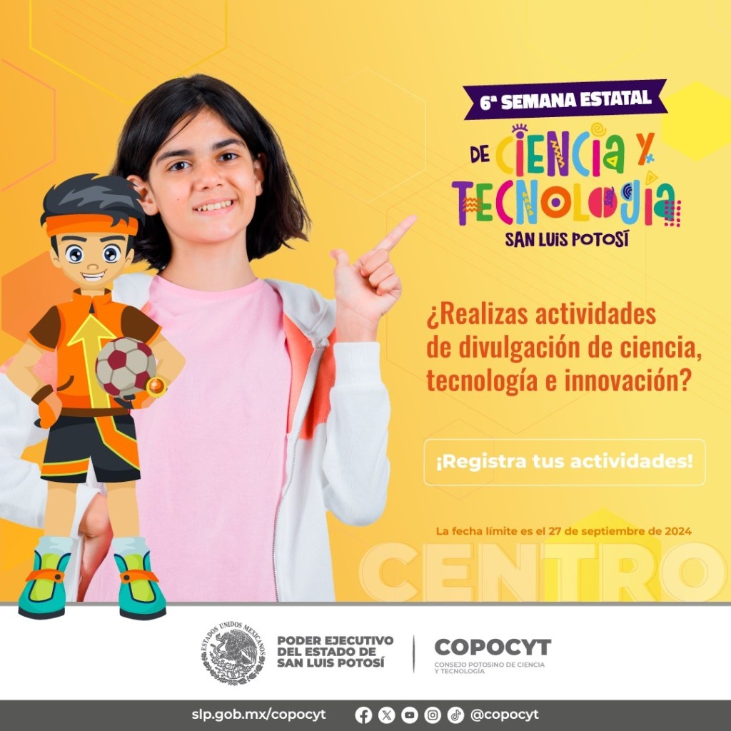El Gobierno del Estado a través del Consejo Potosino de Ciencia y Tecnología (Copocyt), invitan a empresas, instituciones de educación superior, centros públicos de investigación, entidades gubernamentales y organizaciones, a registrar actividades de divulgación científica en la sexta edición de la «Semana Estatal de Ciencia y Tecnología», que se realizará durante octubre de 2024.