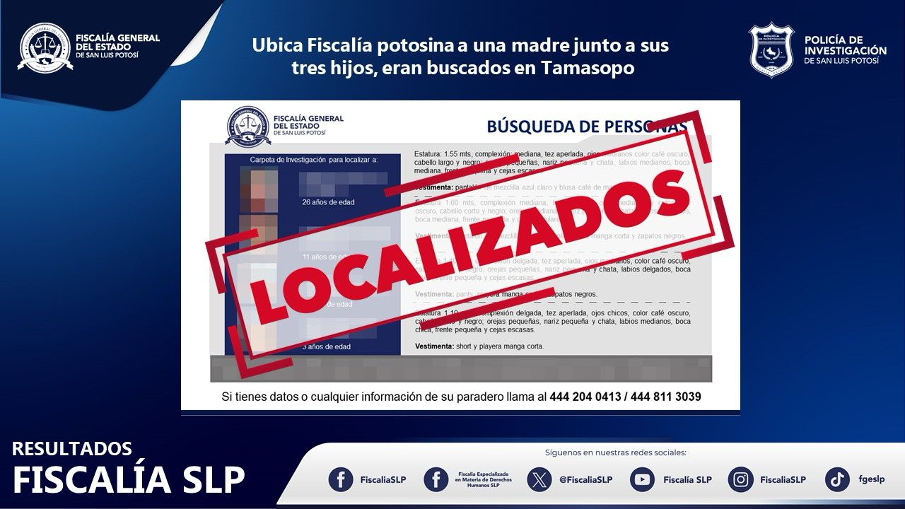 La Fiscalía General del Estado de San Luis Potosí (FGESLP) informa que como resultado de los trabajos que implementa la Dirección General de Métodos de Investigación (DGMI), se ubicó a cuatro personas que tenían ficha de búsqueda en la Huasteca potosina.