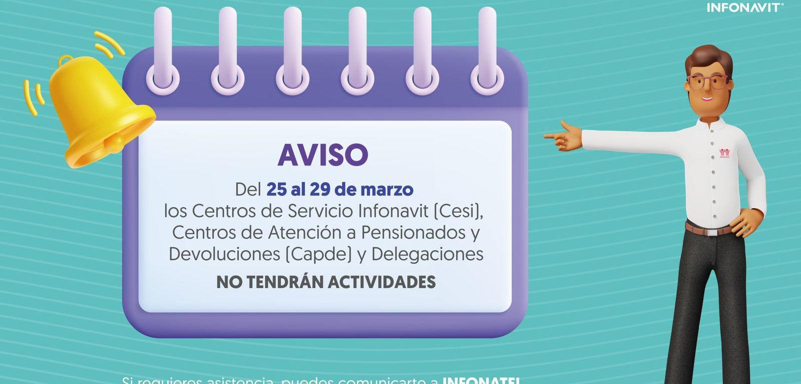Con motivo de Semana Santa, el Instituto del Fondo Nacional de la Vivienda para los Trabajadores (Infonavit) suspenderá las actividades en sus Centros de Servicio de todo el país, del 25 al 29 de marzo. Las actividades se reanudarán el próximo 1 de abril de 2024, en el horario habitual.
