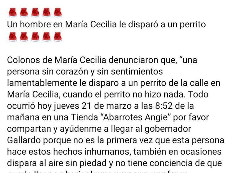 En María Cecilia un hombre habría disparado contra un perro en situación de calle, por lo que podría recibir una pena de hasta cinco años de cárcel