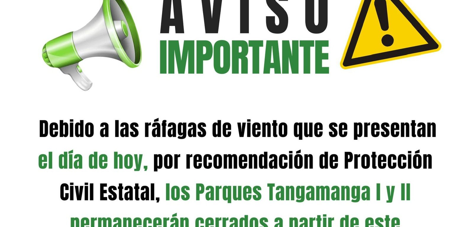 El Poder Ejecutivo del Estado informa que por recomendación de la Coordinación Estatal de Protección Civil (CEPC), a fin de salvaguardar la integridad de las y los potosinos, los Centros Estatales de Cultura y Recreación Tangamanga (Cecurt), se anuncia el cierre de los parques, debido a las condiciones climáticas que prevalecen en la capital potosina, con rachas de viento de hasta 60 kilómetros por hora.