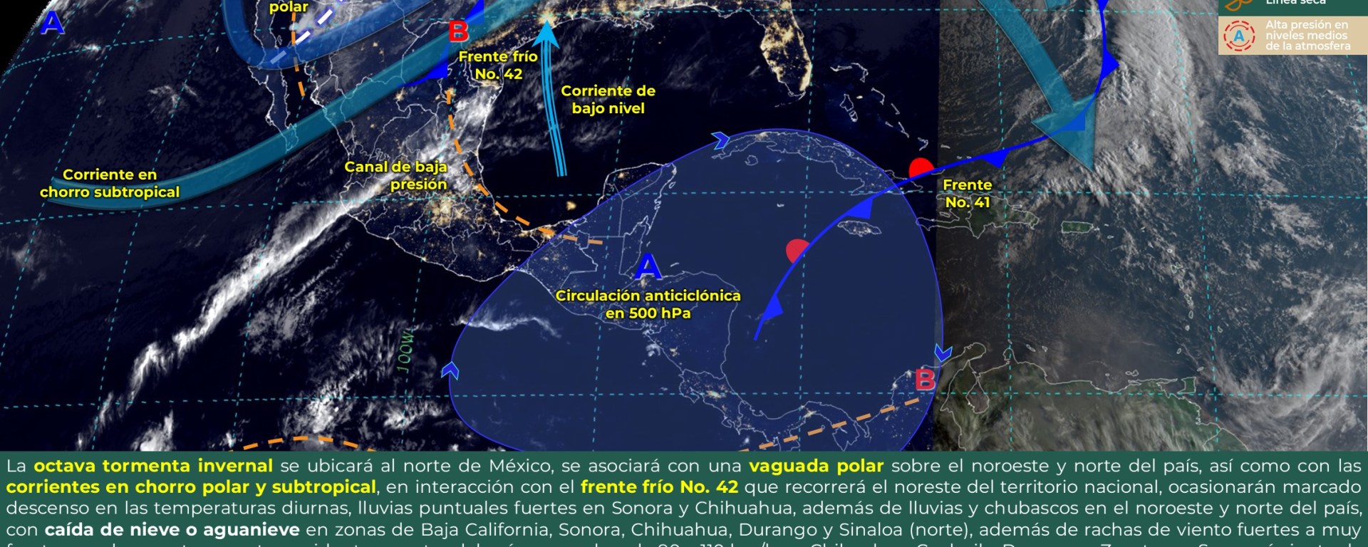 Posible caída de nieve o aguanieve: zonas de Sonora, Chihuahua, Durango y Sinaloa (norte), y durante la mañana en Baja California.