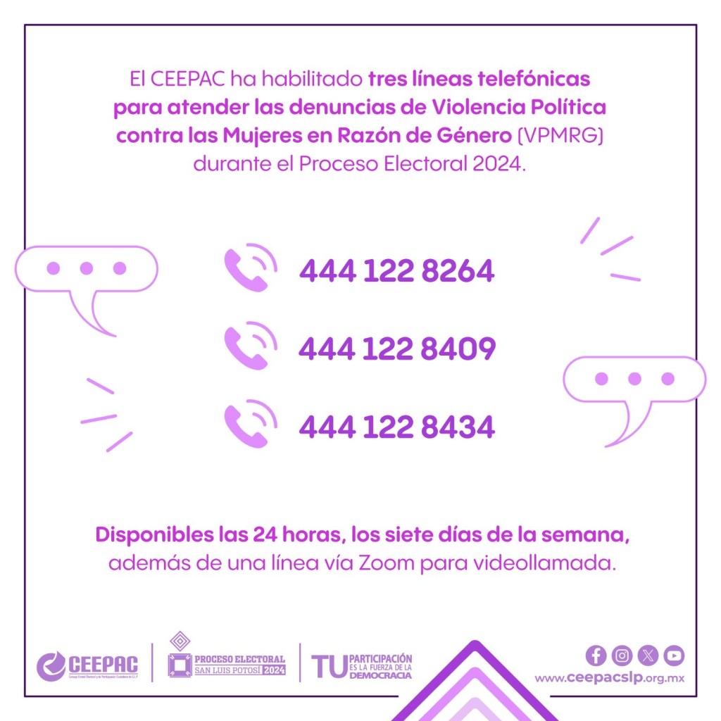 Los números (444)122 82 64, (444)122 84 09 y (444)122 84 34, estarán disponibles las 24 horas de los siete días de la semana y serán operados a través de la Coordinación de Género e Inclusión, como primer respondiente ante una situación de violencia, como agresiones o amenazas contras mujeres candidatas o funcionarias electorales, además se ha habilitado una línea Zoom, totalmente confidencial, para asegurar que la distancia no sea un obstáculo para la atención.