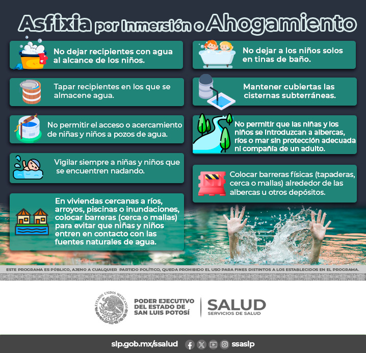 El ahogamiento o asfixia por Inmersión es el proceso en el cual se sufren dificultades respiratorias por sumersión o inmersión en un líquido y puede desencadenar en muerte, o lesiones no fatales. Ante tal panorama, los Servicios de Salud del Estado de San Luis Potosí, de manera permanente emiten algunas recomendaciones para evitar lesiones o incluso la muerte de niñas y niños.