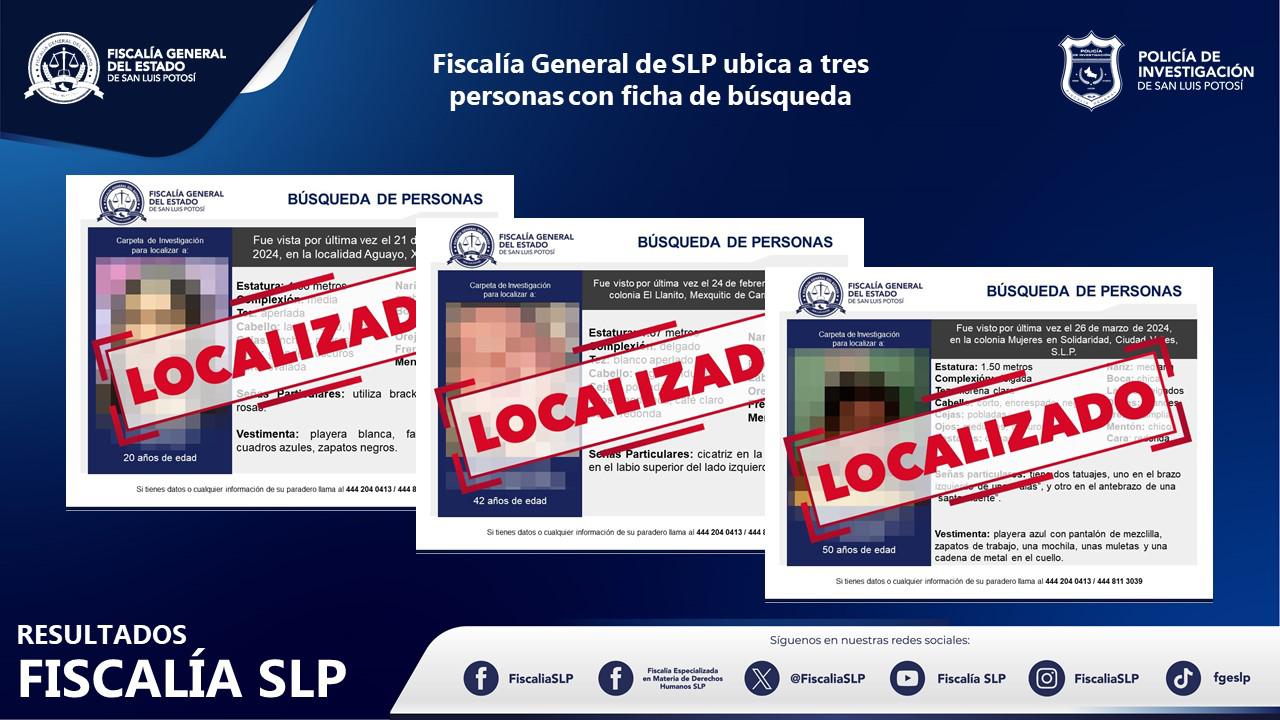 A través de distintas acciones, tres personas que eran buscadas en territorio potosino fueron encontradas por agentes de la Dirección General de Métodos de Investigación (DGMI), informó la Fiscalía General del Estado de San Luis Potosí (FGESLP).