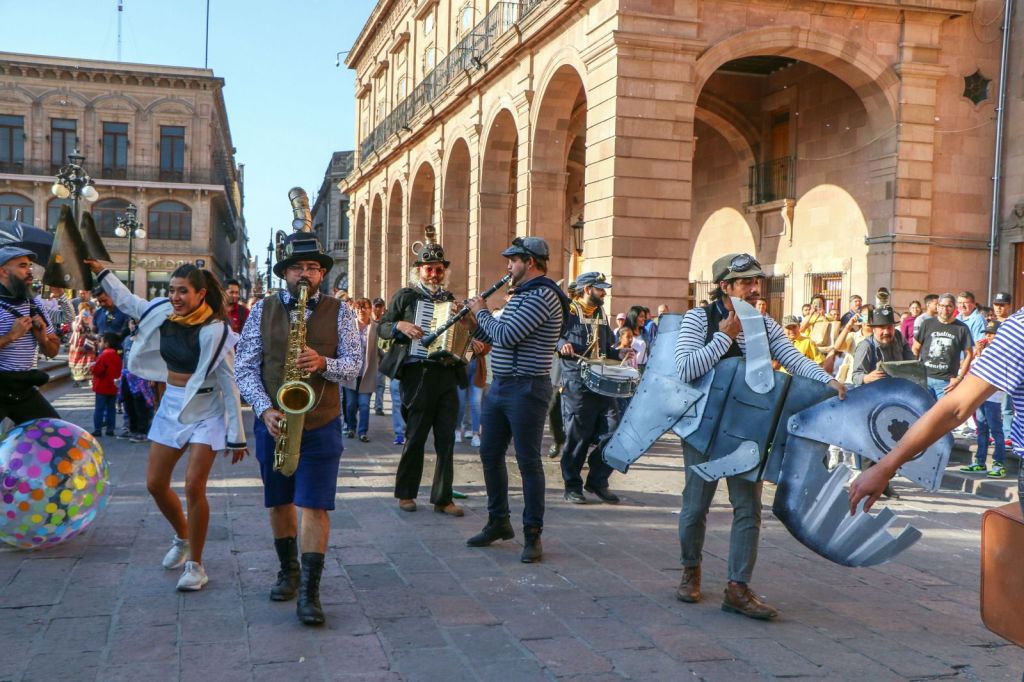 Nuevamente los talentosos artistas tapatíos de Pneumus tomaron la Plaza de Armas y la calle de Zaragoza con su Marcha Submarina, una comparsa que representa el rodaje de una película surrealista bajo el mar: claqueta, camarógrafo, cácaro, músicos, pelota playera, peces de hojalata. Una divertida reflexión sobre el problema de la contaminación de mares y ríos.