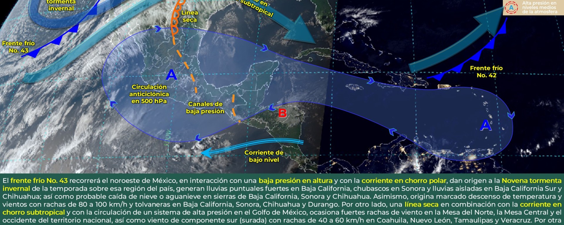 Posible caída de nieve o aguanieve: sierras de Baja California, Sonora y Chihuahua.
