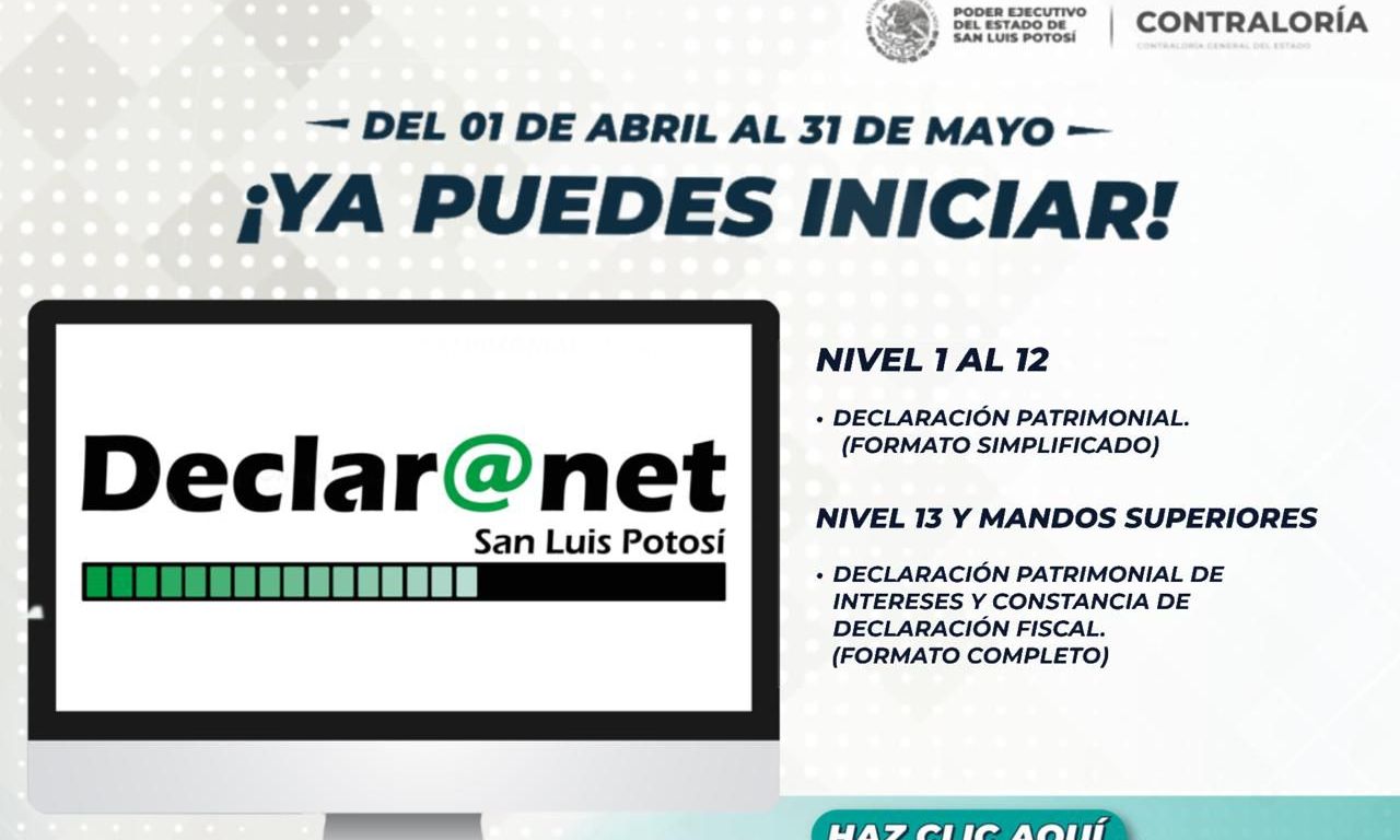 La presentación de las declaraciones se realizará a través de la plataforma “Declar@netSanLuis”, disponible en la página web: https://declaranet.slp.gob.mx/, no obstante, la Contraloría General del Estado brindará atención presencial desde la oficina ubicada en Prolongación Coronel Romero 110, Colonia Alamitos, y asesoría telefónica en el (444) 814 80 66, extensiones 103, 113 y 147 o al 444 391 0391 vía WhatsApp, de 8:00 a 15:00 horas.