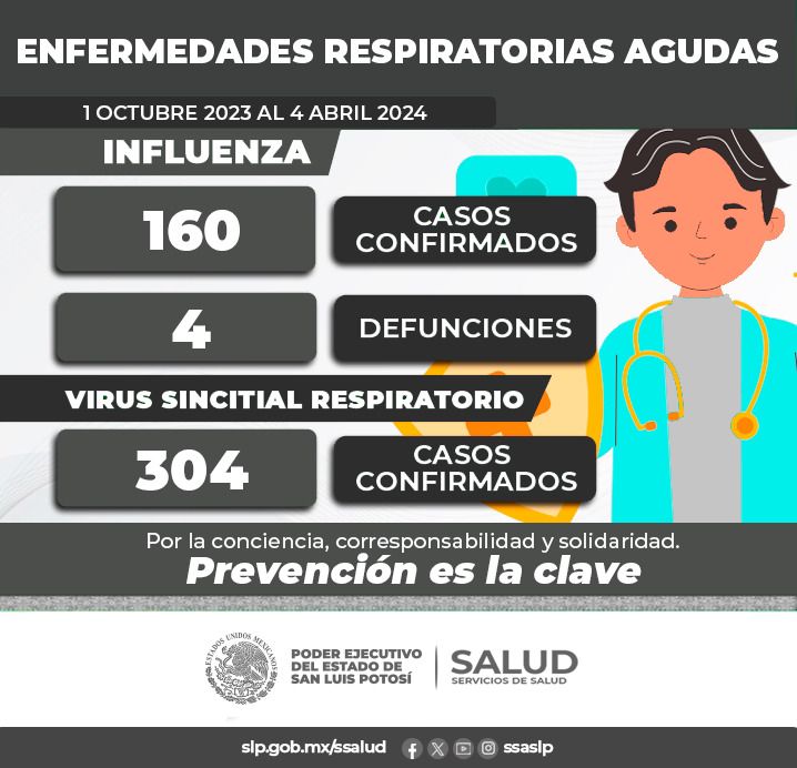 Del 29 de marzo al 04 de abril se registró un nuevo caso de influenza, sumando desde octubre 2023 inicio de la temporada invernal al 4 de abril del 2024 160 casos y cuatro defunciones de en el Estado, mientras que en el mismo periodo de tiempo se han confirmado un total de 304 casos de virus sincitial respiratorio, sin nuevos casos reportados.