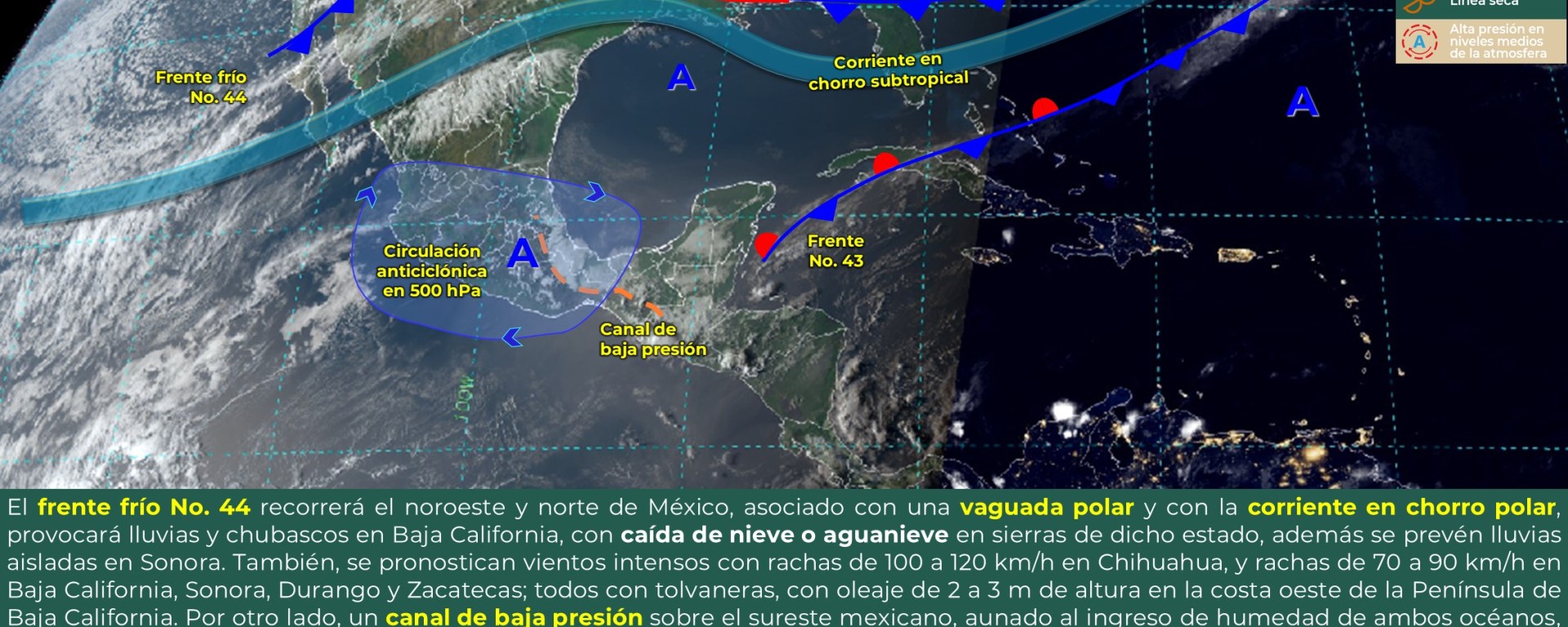 Posible caída de nieve o aguanieve: sierras de Baja California y Sonora (durante la mañana).