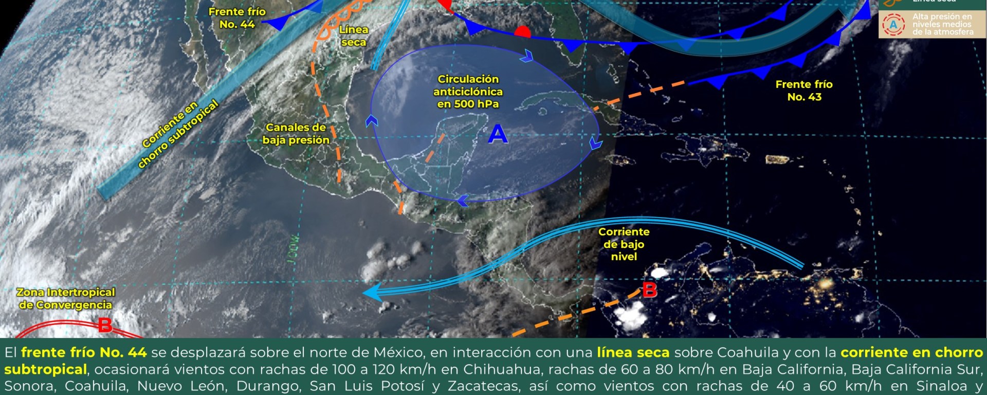 Vientos con rachas de 50 a 70 km/h: Tabasco, Campeche y Yucatán; con tolvaneras: Chihuahua, Durango, Coahuila, Nuevo León, Zacatecas y San Luis Potosí.