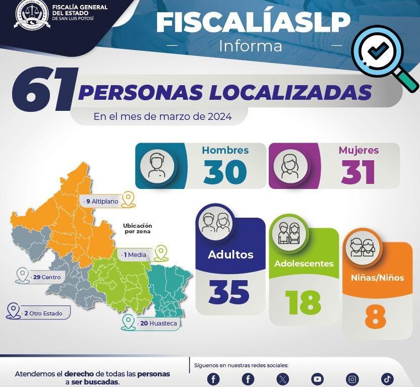 Durante marzo de 2024, la Fiscalía General del Estado de San Luis Potosí (FGESLP) localizó a 61 personas por las que existían fichas de búsqueda.