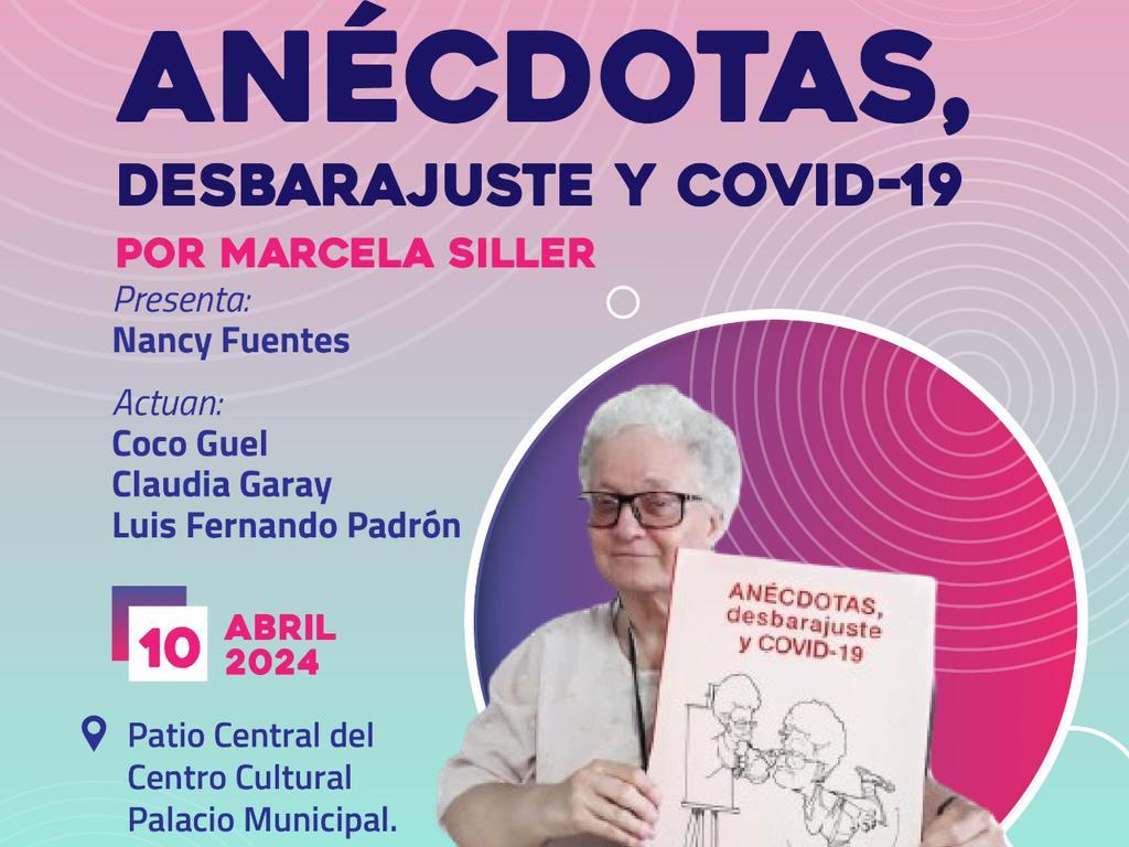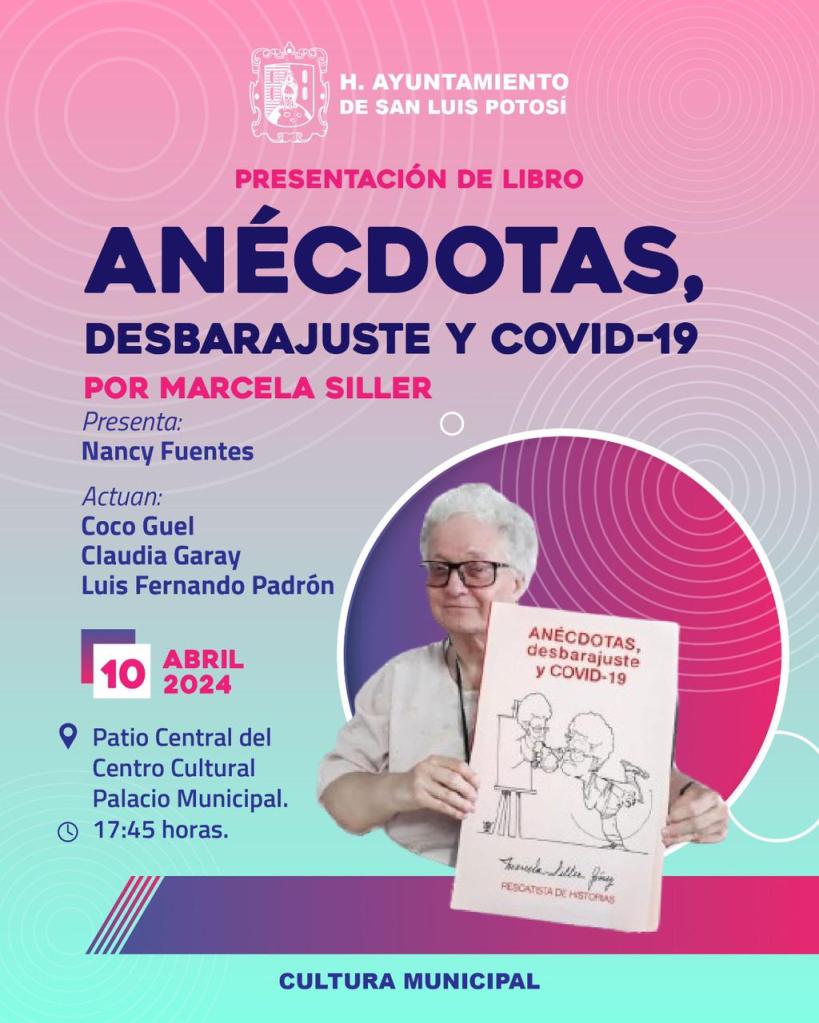 La Dirección de Cultura Municipal invita este miércoles en que se da paso a la literatura a conocer el libro: “Anécdotas, desbarajuste y Covid-19”, de la escritora potosina Marcela Siller, el cual se presentará el miércoles 10 de abril del 2024 en el Centro Cultural Palacio Municipal, a las 17:45 horas.