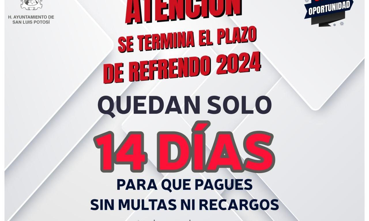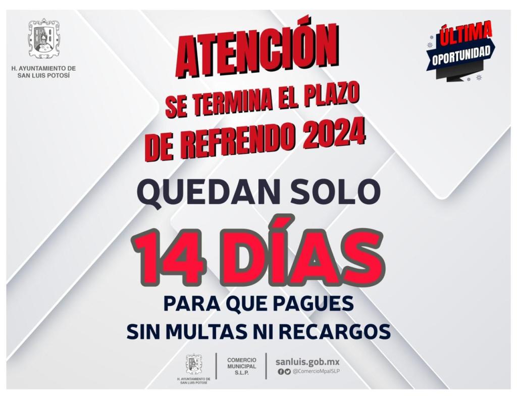 La Dirección de Comercio Municipal de San Luis Potosí, invita a todos los comerciantes y dueños de negocios que aún no realizan su refrendo de licencias de funcionamiento o anuncios al 2024 a realizarlo, ya que la extensión del plazo vence el próximo 30 de abril del año en curso, para evitar multas y recargos. Este procedimiento se puede realizar en línea.