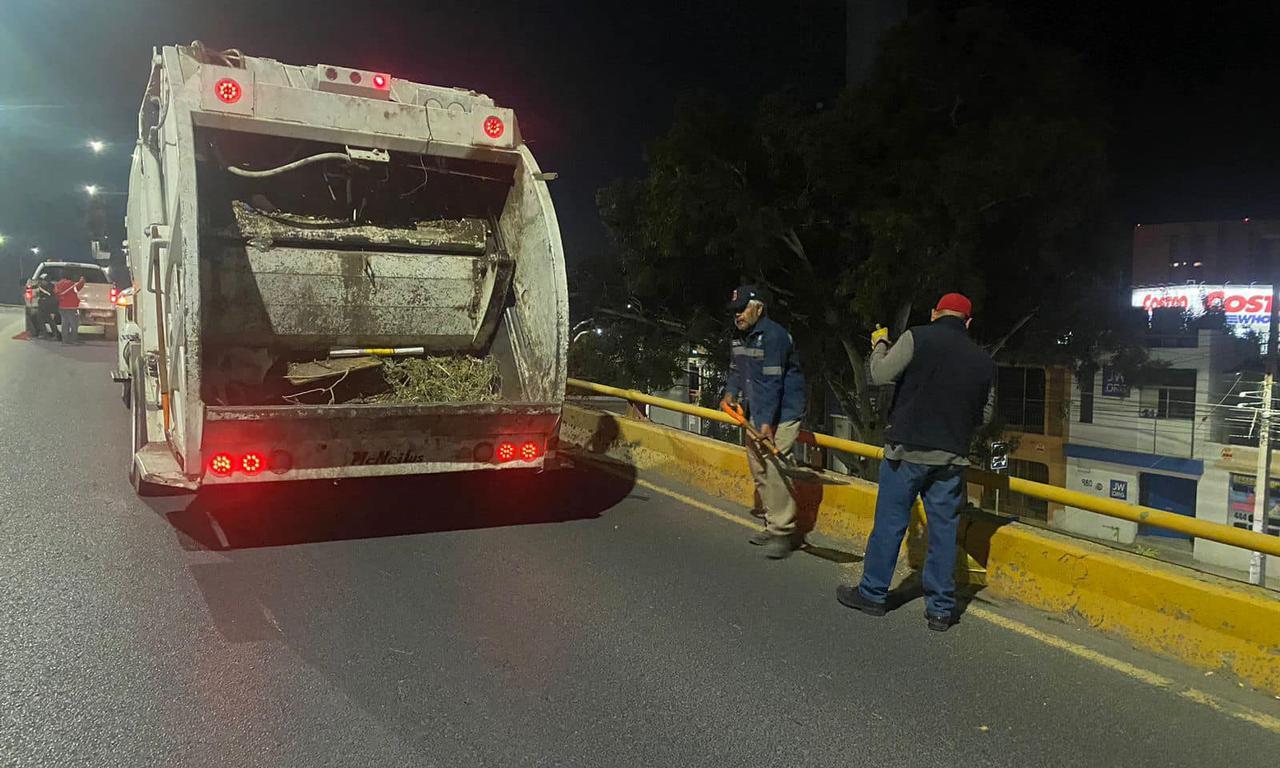 En los carriles centrales de la avenida Salvador Nava Martínez se realizan acciones de deshierbe, limpieza general y recolección de excedentes.