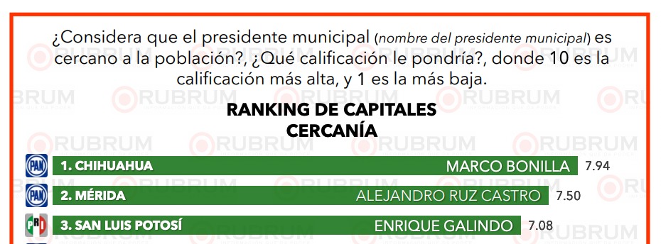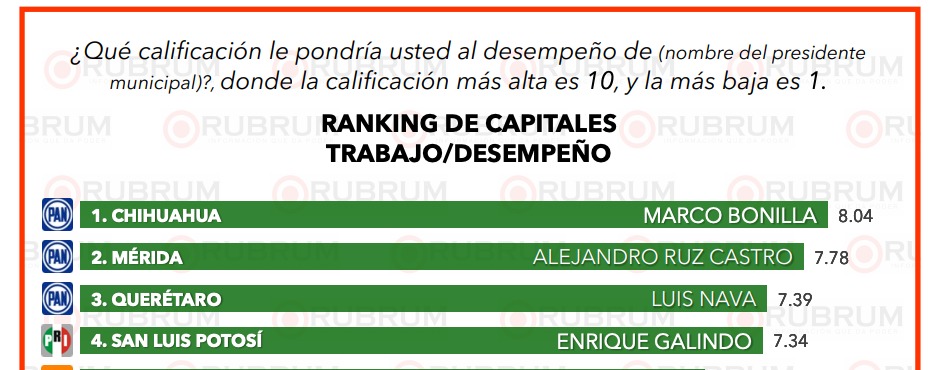 García Lozano señaló que estas buenas calificaciones son consistentes con la encuesta de intención de voto que realizó Rubrum para la próxima elección de presidente municipal de San Luis Potosí, en la que Galindo Ceballos tiene una preferencia de 41.5 por ciento de la ciudadanía en la búsqueda de la reelección por la coalición conformada por PRI, PAN y PRD, muy por encima del 32.9 por ciento de su más cercana perseguidora, Sonia Mendoza Díaz, de Morena, PT y PVEM.