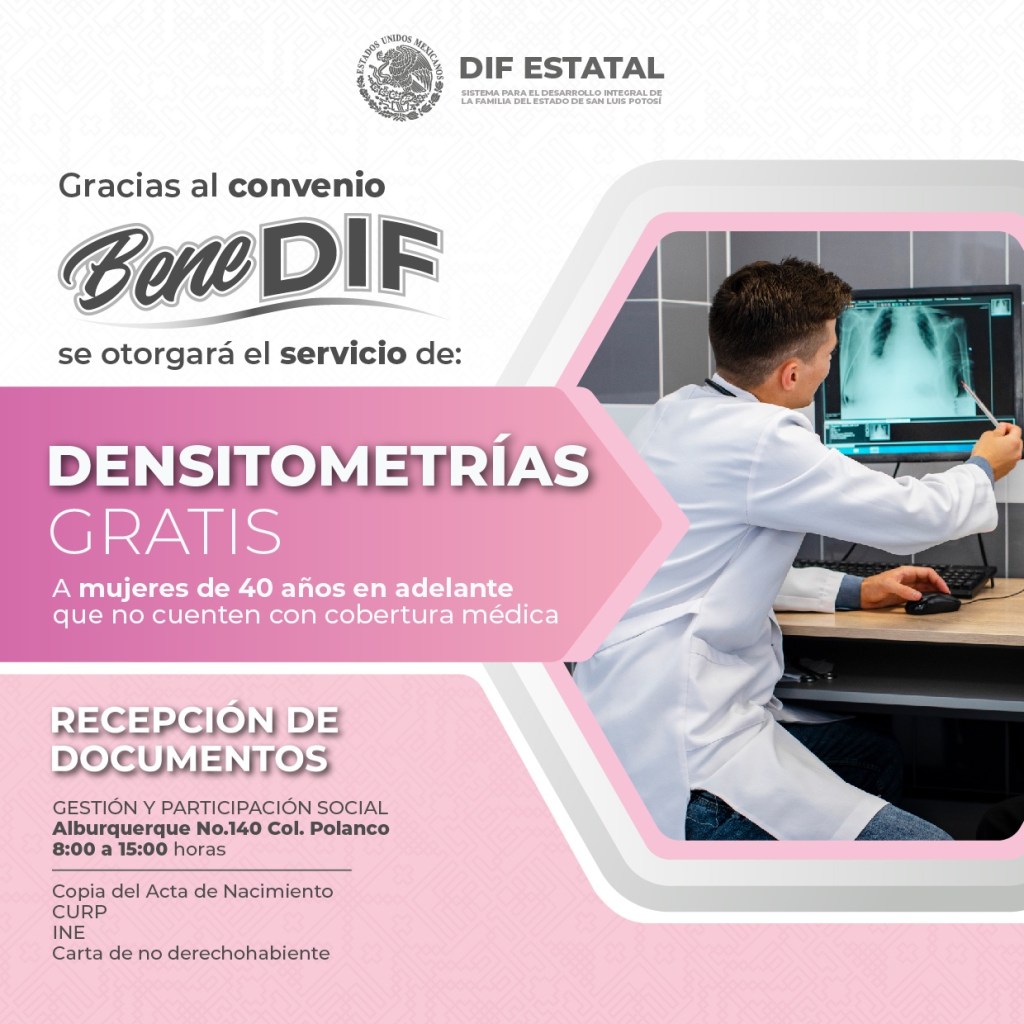 Gracias a las gestiones del Sistema Estatal para el Desarrollo Integral de la Familia (DIF), las y los potosinos podrán realizarse estudios de mastografías, densitometrías y antígenos prostáticos