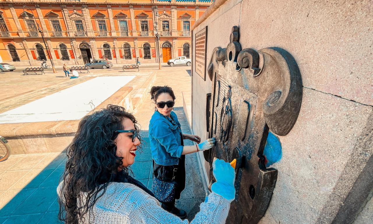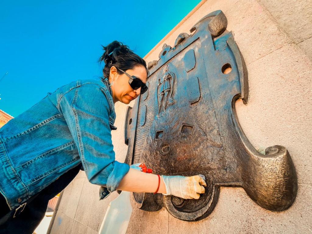 La Unidad de Gestión del Centro Histórico del Ayuntamiento de San Luis Potosí, a través del área de Patrimonio Cultural Conservación y Proyectos, realiza la eliminación de grafiti del Escudo de Armas de la ciudad que se encuentra en la Plaza de Fundadores y otras piezas escultóricas de bronce que se ubican en la zona Centro, luego de que fueran intervenidas con pintura en aerosol.