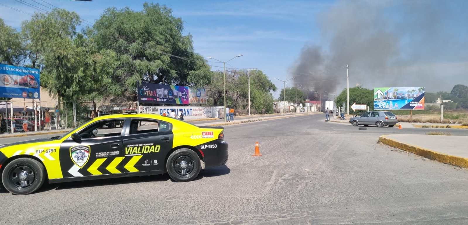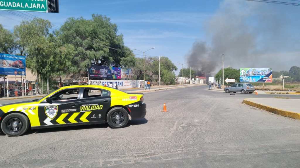 Elementos de Policía Vial coadyuvan en labores para sofocar un incendio en un establecimiento comercial ubicado en la calle Bosque de las Flores en Villa de Pozos.