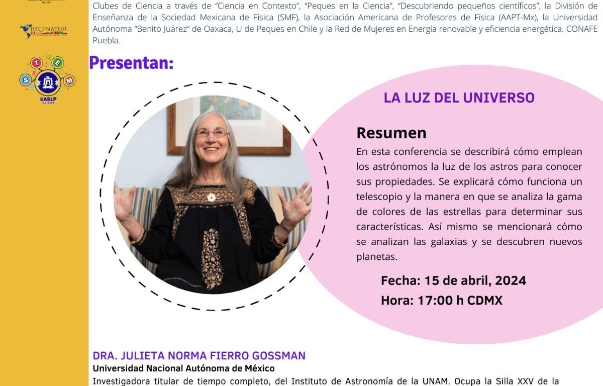 Como parte de las actividades del “Programa Internacional Niñas y Mujeres Haciendo Ciencia”, liderado por la doctora Pilar Suárez Rodríguez, catedrática e investigadora de la Coordinación Académica Región Huasteca Sur (CARHS) de la Universidad Autónoma de San Luis Potosí (UASLP), la doctora Julieta Fierro Gossman impartirá la conferencia virtual “La luz del Universo”.