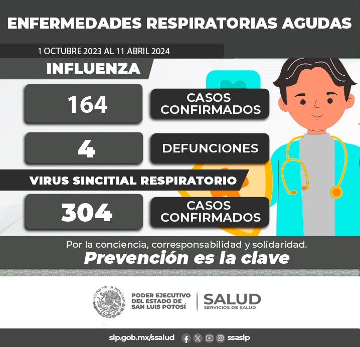 De octubre 2023 inicio de la temporada invernal a abril 11 del 2024, se tienen registrados 164 casos y cuatro defunciones de influenza en el Estado, hay que aclarar que se presentaron dos casos en esta semana, mientras que en el mismo periodo de tiempo se han confirmado un total de 304 casos de virus sincitial respiratorio, sin nuevos casos reportados.