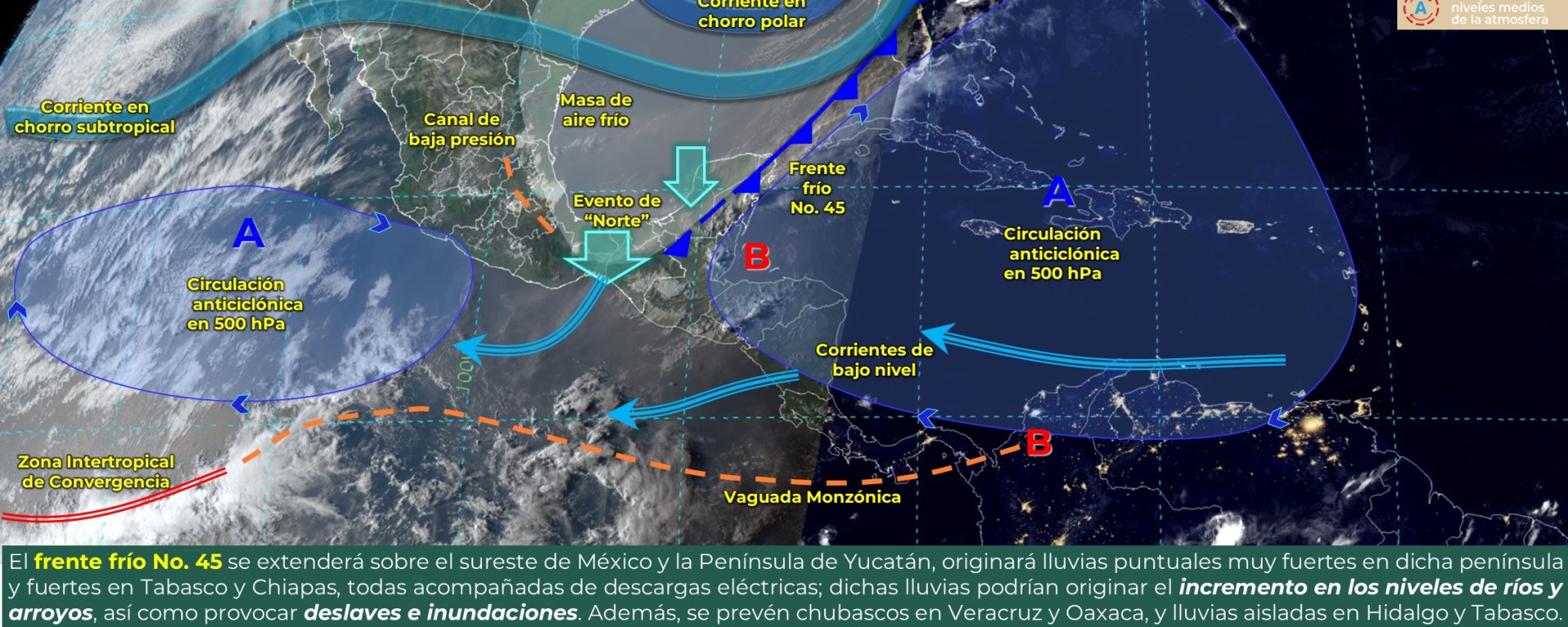 Viento de componente norte con rachas de 40 a 60 km/h: Istmo de Tehuantepec, Tabasco, Campeche, Yucatán y Quintana Roo; con oleaje de 2 a 3 metros de altura: Golfo de Tehuantepec.