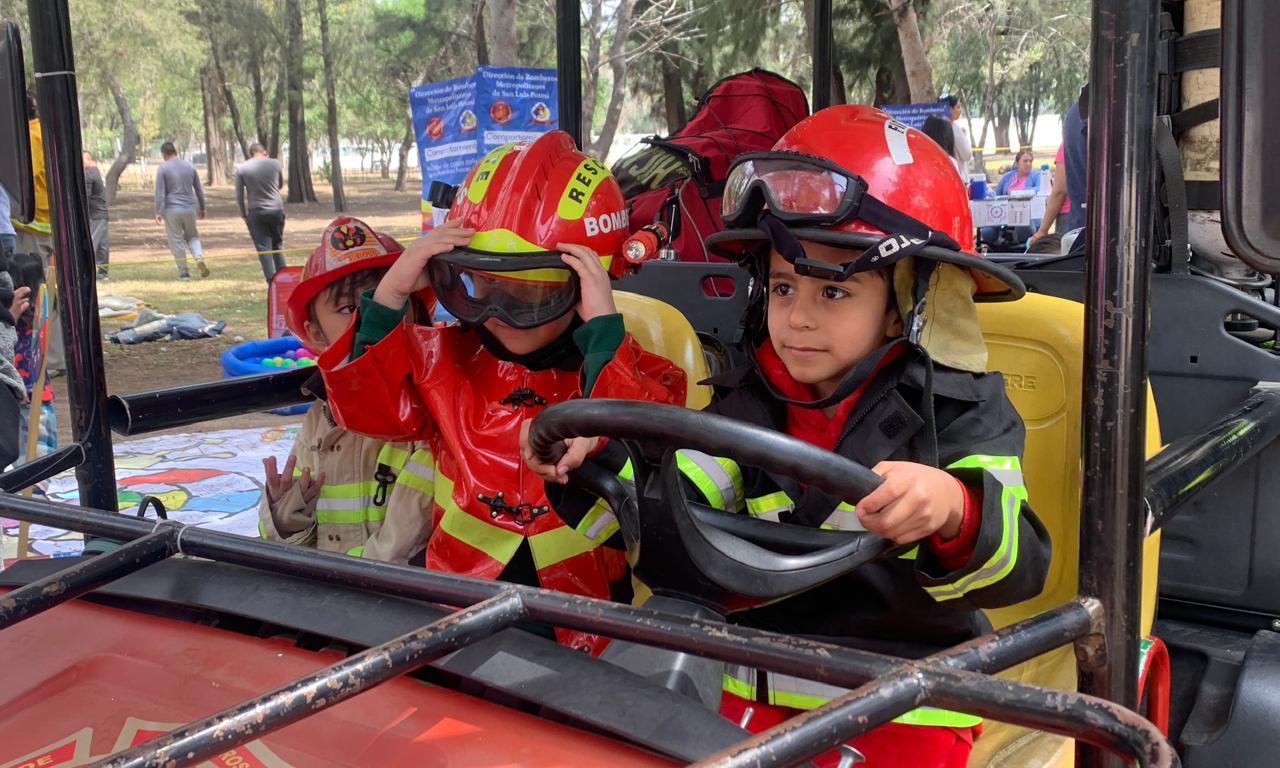 Por parte del Cuerpo de Bomberos Metropolitanos de San Luis Potosí se realizaron dinámicas y competencias dirigidas a niñas y niños de tres a 12 años. Las y los menores también realizaron, dibujos y manualidades, además tuvieron la oportunidad de conocer los vehículos del cuerpo de bomberos y portar un traje.