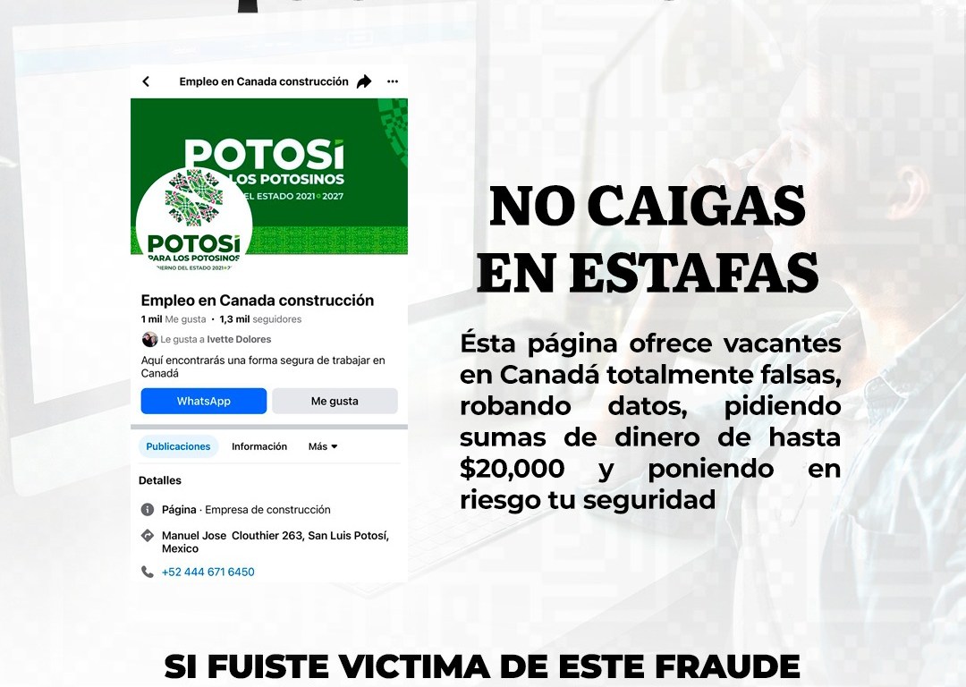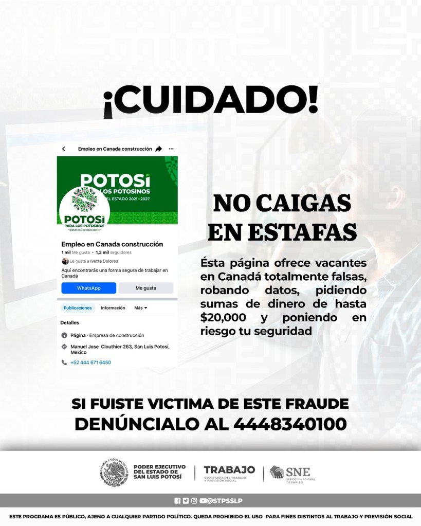 El Poder Ejecutivo del Estado, a través de la Secretaría del Trabajo y Previsión Social (STPS), alerta sobre posibles delitos de fraude o extorsión que se intentaron concretar desde un perfil de Facebook donde ofrecen empleo en Canadá.