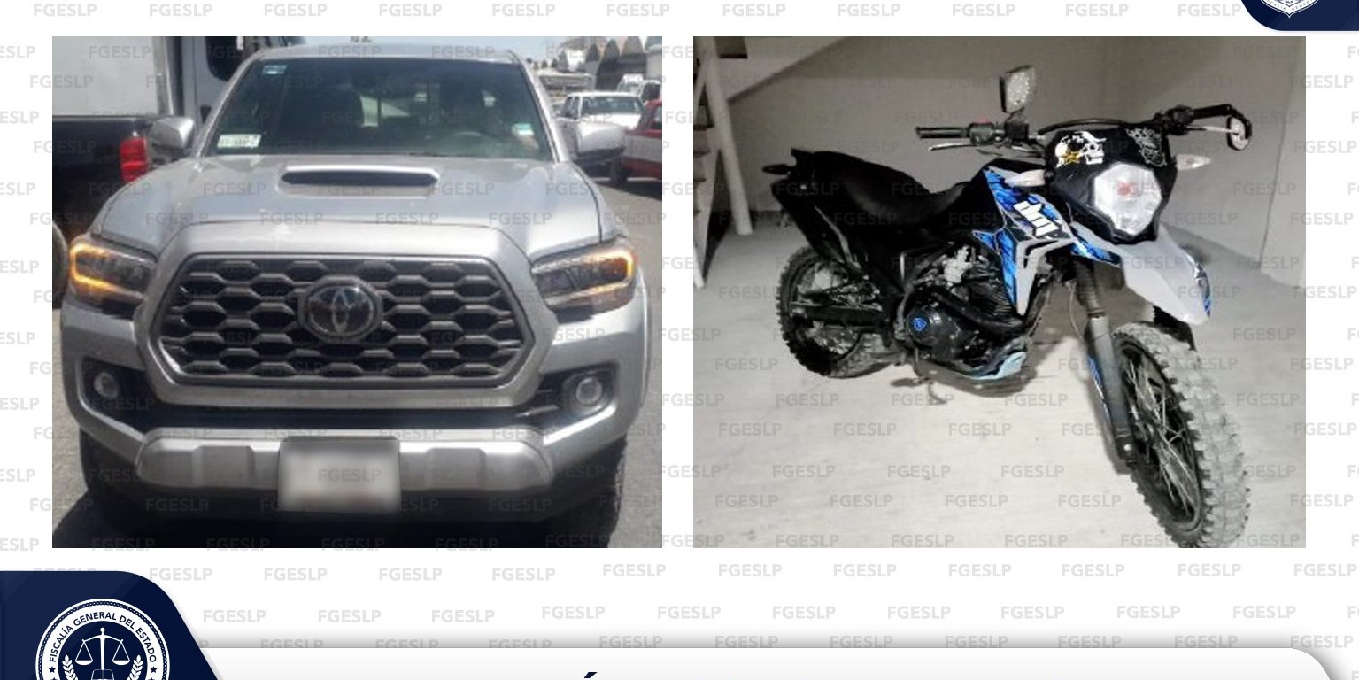 Agentes de la Dirección General de Métodos de Investigación (DGMI) aseguraron un automotor y una motocicleta en la demarcación, informó la Fiscalía General del Estado de San Luis Potosí (FGESLP).