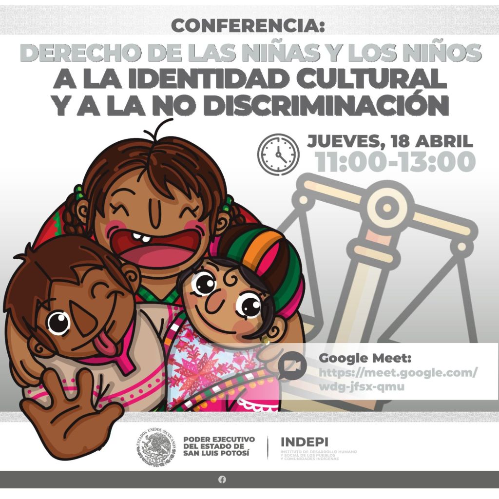 El jueves 18 de abril a las 11:00 horas, El Poder Ejecutivo del Estado, a través del Instituto de Desarrollo Humano y Social de los Pueblos y Comunidades Indígenas (Indepi) brindará la Conferencia “Derecho de las Niñas, Niños y Adolescentes a la Identidad Cultural y a la No Discriminación”, que se realizará de forma virtual, en el siguiente enlace: https://meet.google.com/wdg-jfsx-qmu.