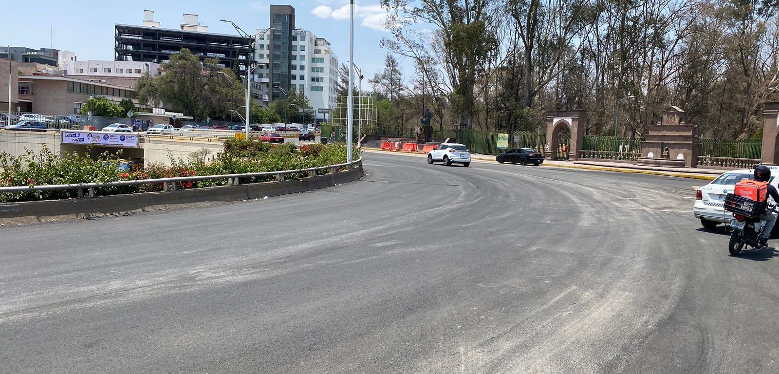 La noche del lunes 15 y martes 16 de abril se avanzó en la rehabilitación del pavimento en la Glorieta y ya se tiene programada la aplicación de pintura vial correspondiente en todo el circuito y esta área, así como la señalética en las siguientes semanas.