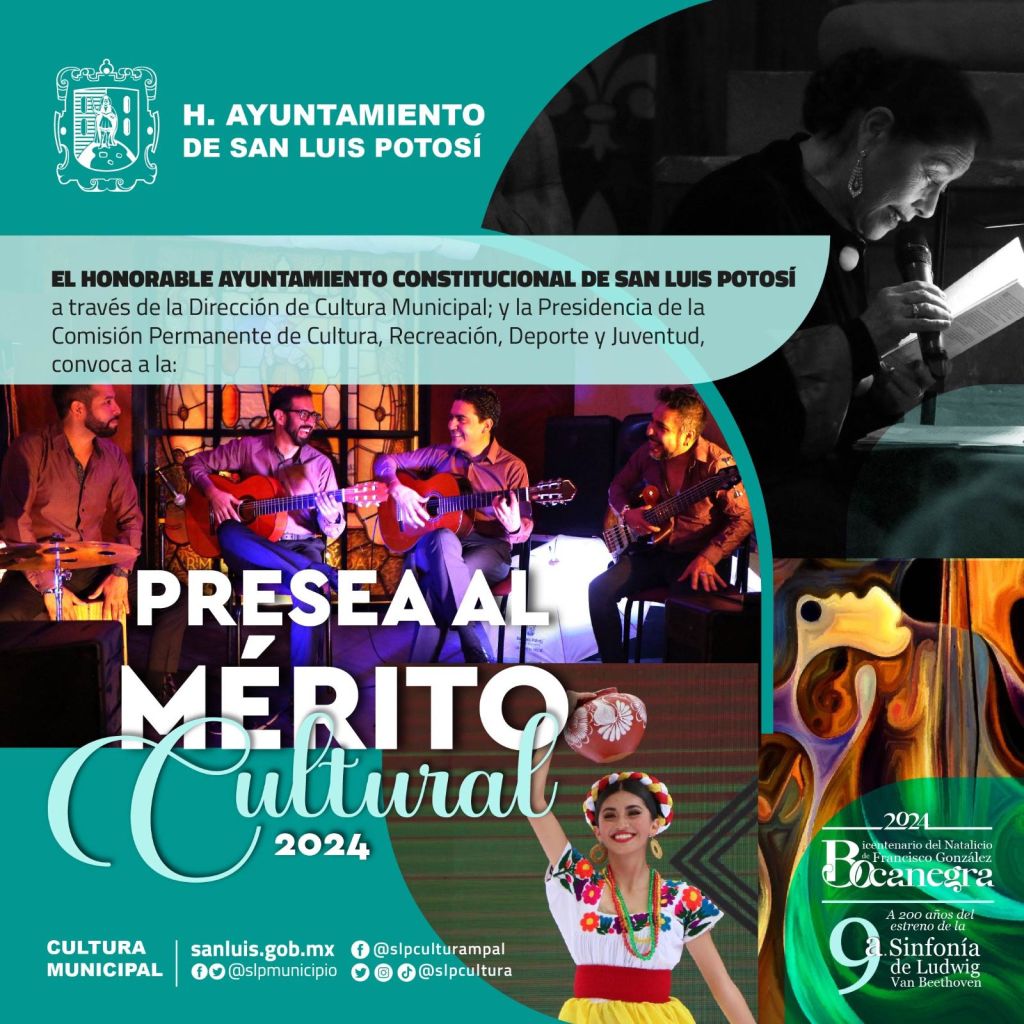 La Dirección de Cultura Municipal y la Comisión de Cultura, Recreación, Deporte y Juventud invitan a la comunidad cultural potosina para que propongan candidaturas a recibir la Presea al Mérito Cultural 2024, misma que busca reconocer personas u organizaciones que se han destacado en la gestión y promoción cultural, que han contribuido a la promoción de las artes, las tradiciones, la producción, capacitación y conocimiento de las distintas manifestaciones culturales.