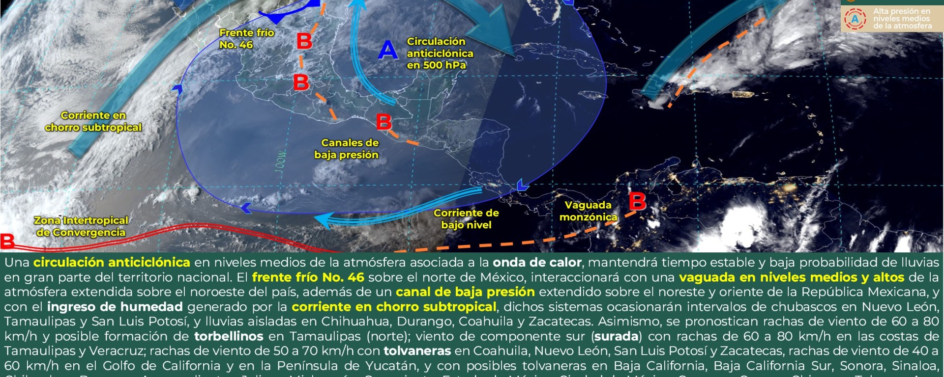 Viento con rachas de 40 a 60 km/h: Campeche, Yucatán y Quintana Roo; y con posibles tolvaneras: San Luis Potosí, Zacatecas, Aguascalientes, Jalisco, Guanajuato y Tabasco.