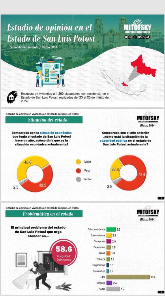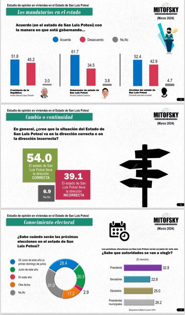 La encuesta se levantó en 1,200 viviendas en el estado de San Luis Potosí, del 23 al 25 de marzo; de los encuestados el 51.8 estuvo de acuerdo con el gobierno del presidente Andrés Manuel López Obrador; con el gobierno de Ricardo Gallardo Cardona el 61.7; sobre el rumbo correcto o incorrecto del estado, el 54.0 afirmó que se va por la dirección correcta.
