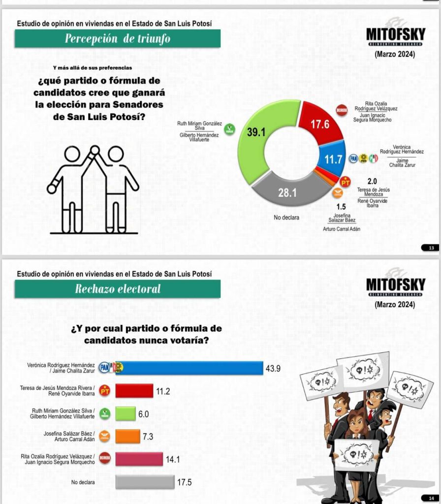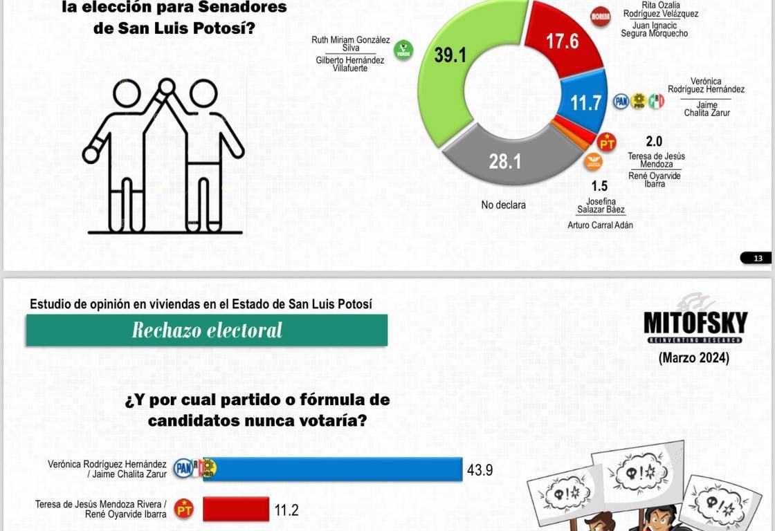 En segundo lugar aparece Rita Ozalia Rodríguez de Morena con el 17.6 y con un rechazo del 14.1; mientras la candidata del PRIAN-PRD, Verónica Hernández, se estanca en el tercer lugar con el 11.7, y con el rechazo ciudadano a su persona o partido más alto, de 43.9.